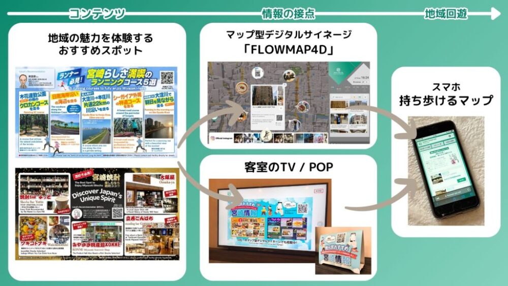 「プリンス スマート イン」ブランド8店舗目となる宮崎より、「FLOWMAP4D」宿泊者がデジタルサイネージのコンテンツをスマホで持ち歩けるシステムを新たなサービスとして提供開始いたします。