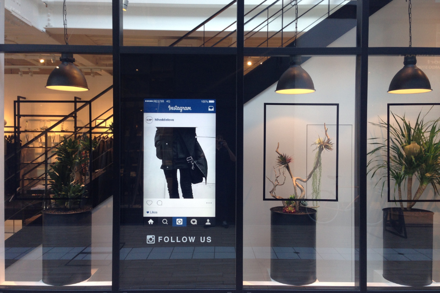 アパレルブランド「221RESTIR」店舗の空間演出に「FLOW」を導入しました。店舗のガラス面に大型ディスプレイを配置し 大型スマートフォンのような演出を実現しています。